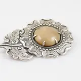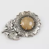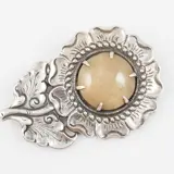 Een schattige bloem broche waarbij het hart is bezet met een licht gelig beige cabochon geslepen koraal van 18mm diameter. De broche draagt geen enkel keur maar is veilig te dateren als 1e helft 20e eeuw.