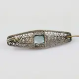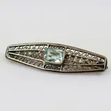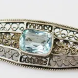 Een art deco filigrain broche met een lichtblauwe synthetische steen. De broche heeft een C-haak met een extra kruis ter versteviging, zie foto's