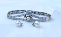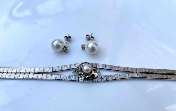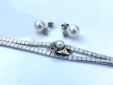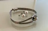 De afmetingen: lengte van de armband 18,5 cm - breedte 1,6 cm in het midden. De oorbellen hebben 8 mm zoetwaterparels en witte topazen bovenop de parel.