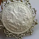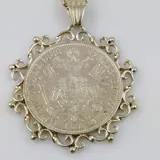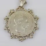 Een zilveren munthanger met een munt uit 1888 van Oostenrijk-Hongarije met een portret van Franz-Jozef I, de man van Sissi.
