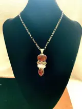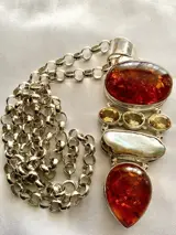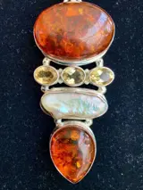 Barnsteen geeft een goede vurige kleur weer, parel heeft een onregelmatige vrije vorm met een levendige tint bij bepaald licht en de drie ovaal geslepen citrienstenen voegen meer schoonheid toe aan de hanger