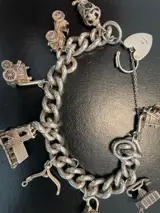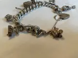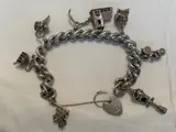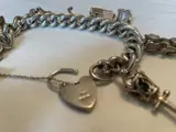 Een gekeurde zilveren bedelarmband met hangslot en bedels. De armband heeft een extra grote curb-schakelketting verenigd door een hartvormige hangslotsluiting en veiligheidsketting, gekeurd voor Birmingham 1974, sponsormerk voor R.G.S. Bedels om op te nemen; stoommachine, telefoon, theepot, kerk & motorwagen. Totaal gewicht ca. 94,0 g. Meet ongeveer 18cm.