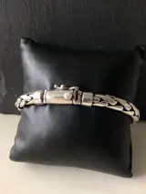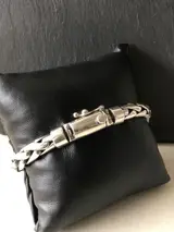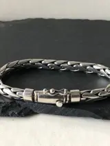 Een zilveren armband met een zware gevlochten schakel en veilige baksluiting en veiligheidsachtje.