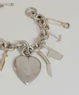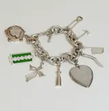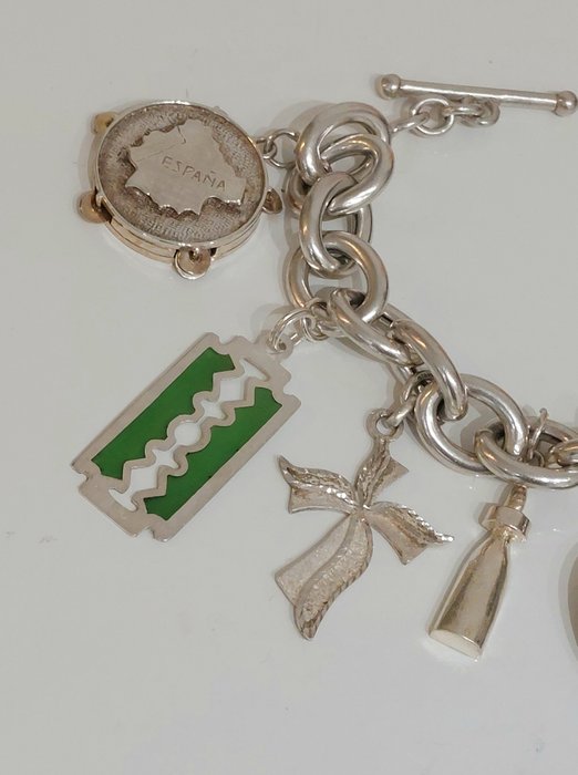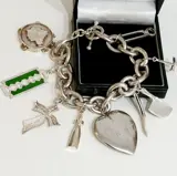 Prachtige vintage zilveren bedelarmband met 9 grote bedels aan een zilveren gourmet armband.