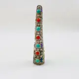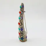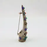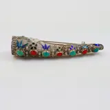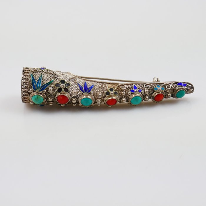 Een Aziatische broche, uitgevoerd in 925 filigrain zilver, bezet met 3 bloedkoraal- en 3 turkoois-cabochons. Verder is de broche versierd met diverse kleuren email. De broche is een voorstelling van een superlange vingernagel, teken van rijkdom want dan hoef je niet te werken voor je geld.