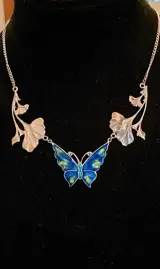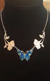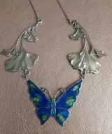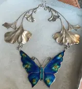 Prachtige vintage zilveren halsketting met een grote geëmailleerde vlinder en ginkgo bladeren in de Art Nouveau stijl. De halsketting heeft een totale lengte van 43 cm en weegt ruim 17,7 gram. Het sieraad is aan de achterzijde van de ginkgo bladeren gemerkt met SILVER en op het slotje met 925. De halsketting is in uitstekende conditie.