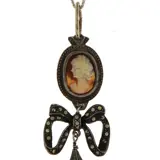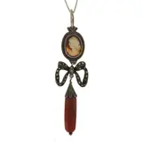 Elegante vintage damescollier in 925% zilver met een bijzondere hanger gevormd door een kleine camee, een strik met een markies en een carneool hanger.