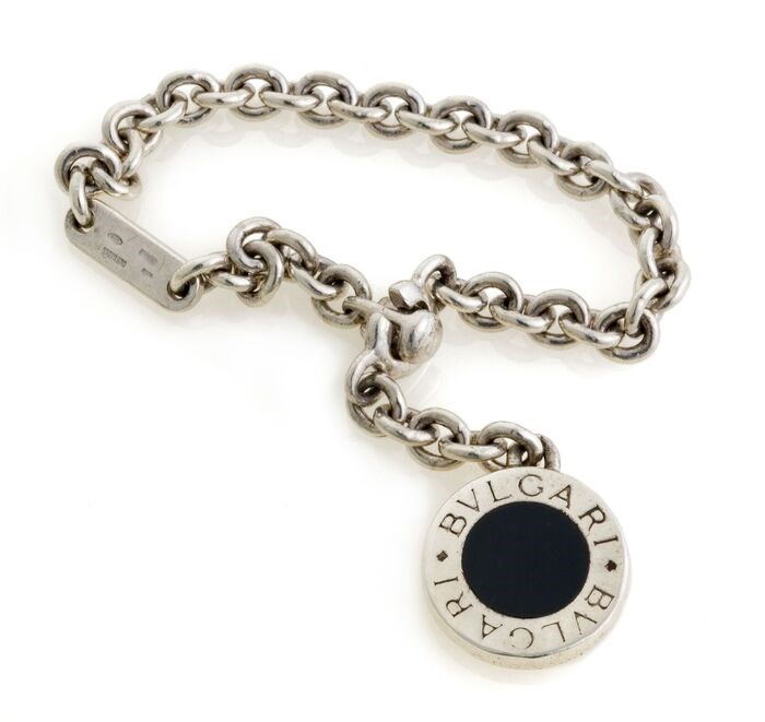 in sterling zilver, kettingontwerp met ronde hanger versierd met zwart email en gegraveerd met de merknaam Bvlgari.