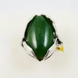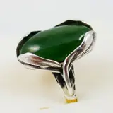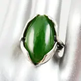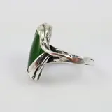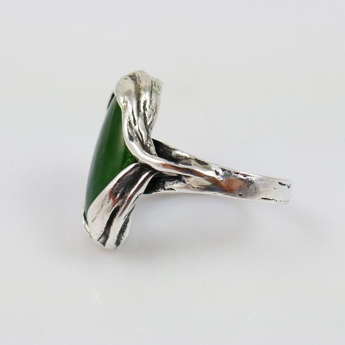 Een prachtige floraal gevormde zilveren ring uit de jaren '70 bezet met een cabochon geslepen groene hardsteen van 13ct. De steen is ca. 12,5 x 21,5 mm groot en weegt ca. 13ct. Als zetting is het zilver als bladeren om de steen heengevouwen.
