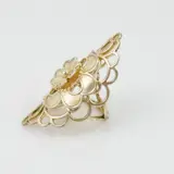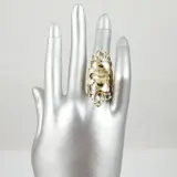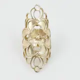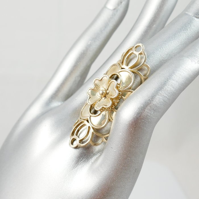 Een langwerpige grote zilveren vintage ring met bloem motieven. De ring is 4,5 cm lang.