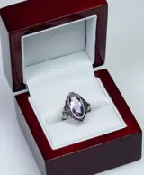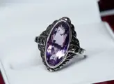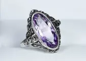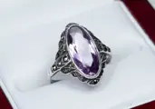 Amethist: ca. 16x7 mm, ovaal geslepen. getest. De steen heeft natuurlijke insluitsels.