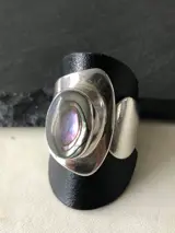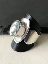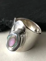 Een strak vormgegeven zilveren ring met daarin een abelone.