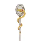 This vintage stickpin, crafted around 1950 in 18K yellow and white gold, depicts the Aesculapius staff, a timeless symbol of medicine and healing. A coiled snake, with a cabochon ruby eye, elegantly winds around the staff, which is adorned with 24 single-cut diamonds. Adding a unique touch, a small real mirror is set within the diamond-encrusted oval, reflecting light and creating a captivating effect. This finely crafted piece marries symbolic meaning with delicate artistry, making it a meaningful token for anyone in the medical field or those drawn to its historic and mythological significance.
