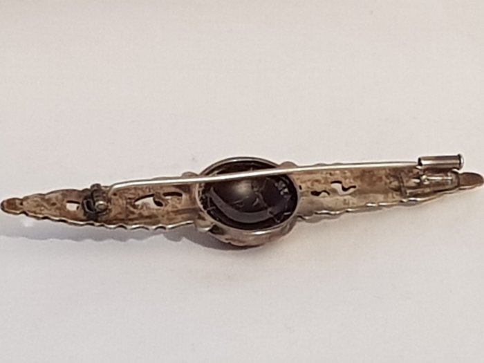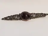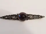 Antieke zilveren brochette, Zilver getoetst en onduidelijk keur, wel meesterteken. Hollandse Broche met antieke grote ronde granaat met facet vlakken.miniaal sleet op de granaat gezien de ouderdom gebruikelijk.. Antiek item