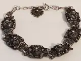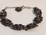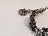 Antieke bewerkte en ajour filigrain dames armband afgezet met zes schakels waarop een bewerkte zilveren knop. Door het zilveren kettinkje kan de lengte van de band tot 20 cm worden gesteld.