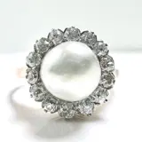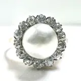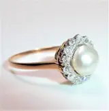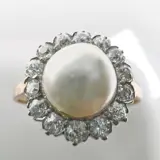 Ring in 585 / 14 kt roségoud met platina in het gebied van de diamanten. Zeer klassiek, rond bloemmotief in de ringkop. In totaal 14 diamanten in antiek slijpsel (Old European Cut) omringen een Akoya-parel in knoopvorm. De diamanten hebben een mooie lichte kleur, gerangschikt G met zuiverheid VS-SI. De warme glans van de antieke slijpvorm geeft de ring zijn individuele charme.