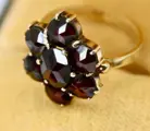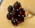 Circa 1900 Antieke Geelgouden ring bezet met 7 grote roos/roos geslepen Boheemse Granaten ca. 8,10ct totaal. Deze ring in licht ovale bloemvorm, prachtig voor verzamelaars, voor cadeau of voor eigen collectie.
