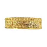 This charming Georgian wedding band, circa 1820, is a stunning example of masterful craftsmanship in 18K warm yellow gold. The delicate filigree and granulation work, featuring small gold balls and refined twists, are hallmark techniques of the era. The ring carries subtle marks, hinting at its long history and adding to its unique character. Wearing this piece is an extraordinary opportunity to own a slice of the past, blending romantic symbolism with the timeless beauty of a bygone era.