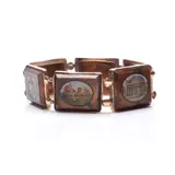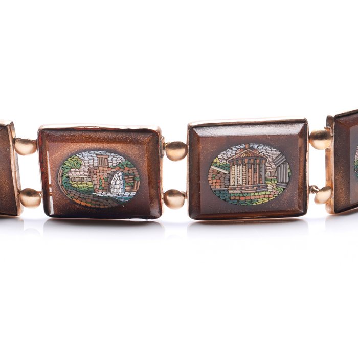 Antiek Italiaans 9kt. geelgouden en goudsteen micromozaïekschakelarmband met afbeeldingen van historische plekken in Rome.