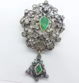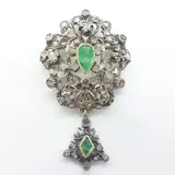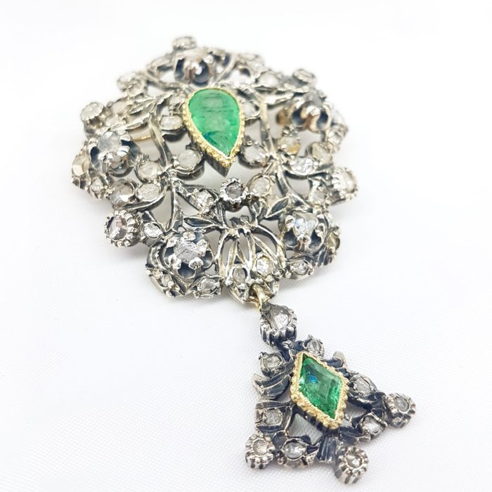 gemaakt van 925 zilver, 12 kt goud in de sluiting en 24 kt puur goud rond de smaragden.