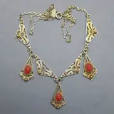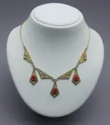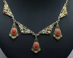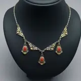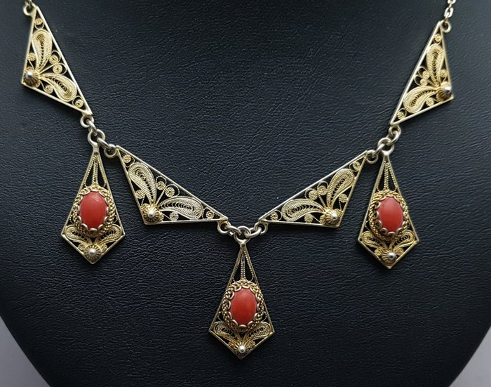 Fraaie filigrain zilveren goud vergulde Art Deco Halsketting met 3 x Cabochon geslepen Bloedkoraal. N.B. In werkelijkheid is de vergulding egaal van kleur wat op de foto's helaas niet goed is te zien.