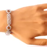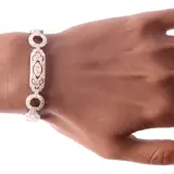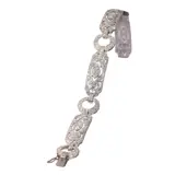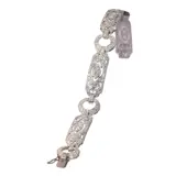 A refined Art Deco diamond bracelet from the 1920s, composed of alternating circular and elongated pierced links, each centred with a marquise-shaped diamond motif. Crafted in platinum and pavé-set with approximately 6.00 carats of old mine and single-cut diamonds, it captures the bold linearity and delicate sparkle characteristic of the period. The design flows with effortless grace across the wrist—discreetly luxurious, yet unmistakably of its time.
