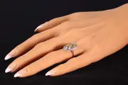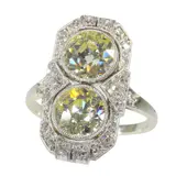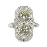 Hailing from the Netherlands, this Art Deco engagement or anniversary ring captures the essence of the 1930s—elegant, functional, yet unapologetically decorative. Crafted in 18K white gold, its abstract, geometric form reflects the period's zest for modernity, a time when the world was dancing to the rhythm of the Roaring Twenties. Adorned with two old mine brilliant cut diamonds and 24 single cuts totalling approximately 2.70 carats, it resonates with the celebratory air of an era that still whispers its stories through such timeless pieces. Marked with a master's touch, it bears hallmarks that ground it firmly in its Art Deco heritage, a treasure with stories etched in its very metal.