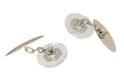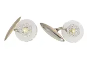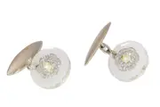 A striking pair of Art Deco cufflinks from the 1920s, each designed with a faceted rock crystal disc suspending a delicate floral cluster of rose cut diamonds and a central pearl. The contrast between crisp geometry and soft detail gives these vintage cufflinks a particularly refined character, while the clear crystal lends them a light, almost icy elegance typical of the period.