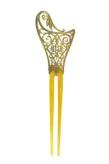 This Art Nouveau French gold hair comb, dating back to circa 1890, is a captivating piece that embodies the wonder of the era's artistic innovation. Crafted from horn and adorned with ten rose cut diamonds, it is an ode to the natural and organic motifs that defined the Art Nouveau movement. The use of horn, a material praised for its lightness and versatility, combined with the luxurious touch of 18K yellow gold, creates a sense of awe in its intricate design and craftsmanship. This hair comb is not just an accessory; it's a testament to the era's ability to transform everyday objects into enchanting works of art, inviting admiration and amazement in its delicate beauty.