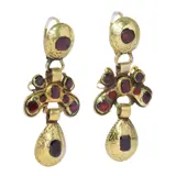 Antique Iberian earrings in 18K yellow gold, crafted around 1750 in the Baroque style. With their long, articulated design and richly curved forms, they embody the exuberance and symmetry typical of the period. Each is set with a suite of glowing garnets, their deep red tones adding warmth and drama. Owing to the delicacy of their goldwork, many such earrings have not survived, making this pair a rare presence on today’s market and a fine testament to Iberian craftsmanship.