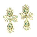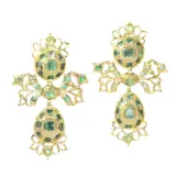 Circa 1750 Iberian Baroque pendent earrings in 18ct yellow gold, each composed of two oval panels linked by a foliate bow and crowned with airy openwork. Set throughout with a lively scatter of emeralds in square and rectangular cuts, their cool green flashing against warm gold and fine beaded borders. The domed, closed back construction gives pleasing depth in profile, with a gentle swing when worn.