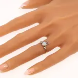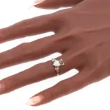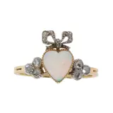 A charming Belle Époque love ring, dating to around 1910, centred on a heart shaped cabochon opal with lively green and blue play of colour, with a hint of yellow and small orange red flashes, tied above with a diamond set bow as though offered as a small romantic gift. The slender gold hoop and delicate rose cut diamond clusters give it the lightness so prized in jewels of this period. Tender in mood yet quietly refined, it captures the sentiment and grace that made Belle Époque jewellery so enduring.