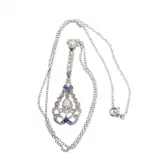 Circa 1920, a platinum pendant on necklace, poised between Belle Époque lightness and early Art Deco geometry. The openwork drop is centred by a pear shaped rose cut diamond, framed by further rose cut diamonds and senailles, with sapphire accents drawing the eye to the scroll like base. Topped with a natural pearl, it sits neatly at the collarbone, a small but assured jewel with the feel of something kept and quietly enjoyed.