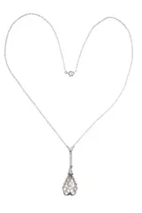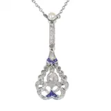 Circa 1920, a platinum pendant on necklace, poised between Belle Époque lightness and early Art Deco geometry. The openwork drop is centred by a pear shaped rose cut diamond, framed by further rose cut diamonds and senailles, with sapphire accents drawing the eye to the scroll like base. Topped with a natural pearl, it sits neatly at the collarbone, a small but assured jewel with the feel of something kept and quietly enjoyed.