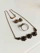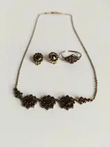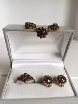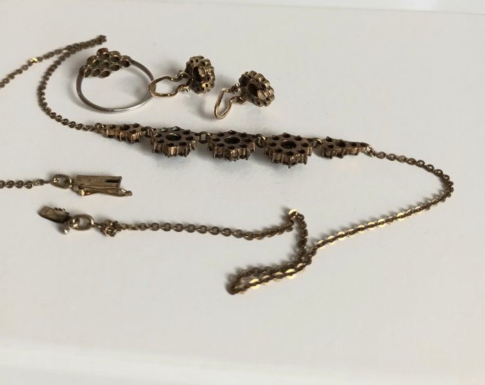 Tombak granaat collier / facet geslepen Bohemia granaat goud verguld lengte 45 cm gewich5t 6.59 gram rozetten groot9.86 mm / klein 5.43 mm ring 9.36 zilver / 57 / 18 ringmaat gewicht 1.54 gram steenmaat 3.09 mm/ facet slijp.9 stuks ring kop 15.69 x 10.43 mm oorbellen rozet met klip gewicht 3.63 gram doorsnede 10.67 mm Alles is getoetst bij juwelier