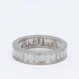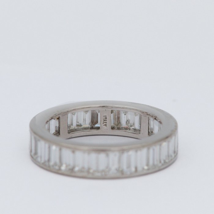 De ring bestaat uit 32 kanaalset, baguette geslepen diamanten, elke E-F kleur en VVS1/VVS2 zuiverheid, in totaal 3.6ct. Gewicht is 4,1 gram.
