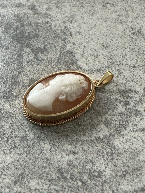 Antieke Camee fijn gesneden in een 14 karaat gouden hanger gevat met mooie natuurlijke glans. Een mooi sieraad waarbij de hanger is afgewerkt met een fijne kabelrand.