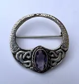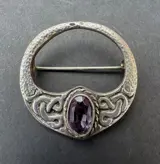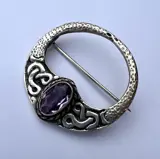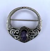 Een stijlvolle vintage broche van sterling zilver en amethist, geïnspireerd op de traditionele Keltische sieraden met ingewikkelde knopen.