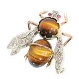 A charming Interbellum brooch from around 1930, this bee is formed in 9 carat red gold and silver, its body set with glowing tiger’s eye and its wings picked out with old rose cut diamonds. Tiny ruby eyes give it a lively, alert character. There is something wonderfully light and witty about it, yet also the careful handwork and quiet elegance that make such period insect jewels so appealing.