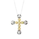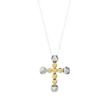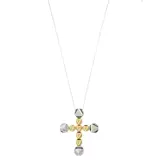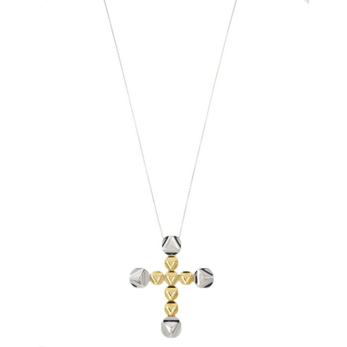 Rolo schakelcollier in witgoud met originele kruishanger, opgebouwd uit ronde elementen met geometrische patronen in reliëf in 18 kt (750/1000) geel- en witgoud, verstelbare sluiting. Merk: Chimento, gemaakt in Italië.