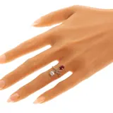 An Art Nouveau toi et moi ring, made around 1900, in 18 carat yellow gold and platinum, its twin terminals curling in a supple botanical sweep, a signature flourish of the Art Nouveau style. An old European cut diamond meets an oval ruby, each in light claw settings, while the crossing shoulders are traced with antique cut diamonds for a soft, candlelit glint. The French name 'Toi et Moi' says it plainly: you and me, held together in one ring, a small vow you can wear, and a story that has every chance of becoming an heirloom.