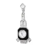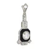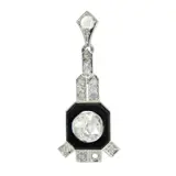 Art Deco pendant, circa 1930, in 18K white gold, centred on an octagonal onyx plaque with a prominent rose cut diamond in a milgrain bezel. The slender, stepped suspension is set with further rose cut diamonds and small rose cut diamonds, giving a crisp play of light against the black ground. Neat, architectural and quietly glamorous, it wears like a small piece of the Jazz Age.