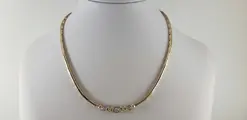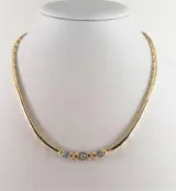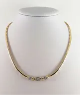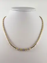 Semi-rigide damescollier van het bekende Italiaanse merk "Damiani" gemaakt in 18 kt geel- en witgoud en n. 1 briljant geslepen diamant van 0,20 ct, kleur G, zuiverheid VVS1, en andere n. 2 briljant geslepen diamanten van 0,11 ct, elke kleur G, zuiverheid VVS1, voor een totaal van 0,42 ct. Verborgen sluiting met veiligheidshaak aan de zijkant.