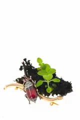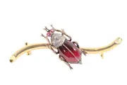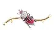Circa 1860, a French Victorian beetle brooch in 18 carat warm yellow gold. Set with garnets and rubies, the domed body is a deep garnet, framed by silver, with rose cut diamonds and tiny senailles sprinkled through the detailing. Nicely modelled legs and a slightly comical face give it that Victorian taste for lively nature studies, turned into something you can pin on and enjoy.