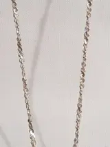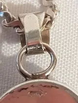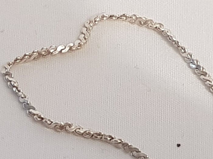 Zilveren collier van 56 cm lang met schakels met facetranden waaraan een ovale zilveren hanger, achterzijde gesloten waarin een ovaal gevormde en geslepen agaath. Het geheel is in nieuwstaat. Vervaardigd in Nederland. Met het zilver merkhet zwaardje.""
