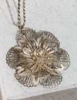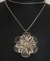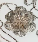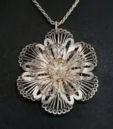 Een prachtige klassieke zilveren filigrain hanger aan een zilveren koord ketting.