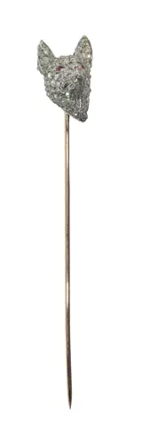 An exquisite Victorian tie pin from the Romantic Period circa 1860 exudes sentimentality and ornate craftsmanship. Crafted from 18k red gold and silver using the revered silver on gold technique, it features approximately 290 rose cut diamonds and senailles, and a pair of rubies, symbolising enduring love. With motifs evoking the era's fascination with nature, a dog's head theme emerges, enriched by gothic and renaissance patterns. This exceptional piece, in excellent condition, reflects the era’s opulence with intricate carvings and enamelling, a tribute to Queen Victoria's devotion. Its inspiration, drawn from Mother Nature and the era's poignant poetry and fashion, encapsulates a deeply symbolic and romantic essence.