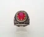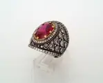 -De robijn is omringd met een geelgouden wassing en verschillende kleine witte pastasteentjes
