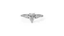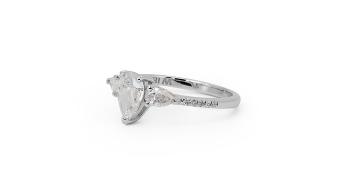 Een prachtige ring met een schitterende natuurlijke diamant van 0,9 karaat peer briljant. Het heeft 0,41 karaat aan zijdiamanten die meer toevoegen aan zijn elegantie. De sieraden zijn gemaakt van 18K witgoud met hoogwaardige glans. Het wordt geleverd met een GIA-certificaat en een mooie juwelendoos.