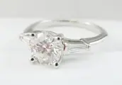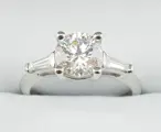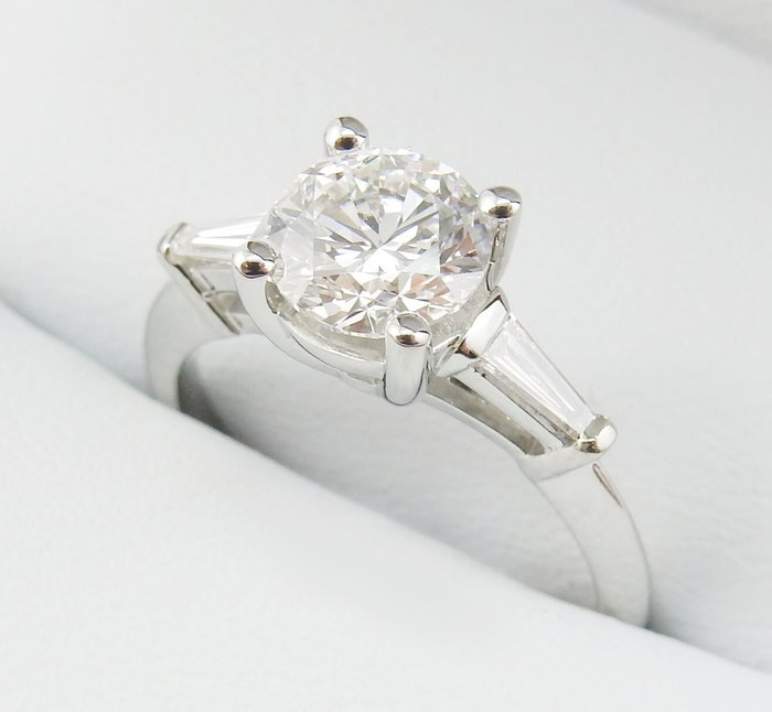 GIA-gecertificeerde 1.30 CTW diamanten ring I/VVS2 Rond geslepen 1.00 CT middensteen en 0.30 CTW Baguette geslepen zijstenen gezet op een 14K geelgouden ring.